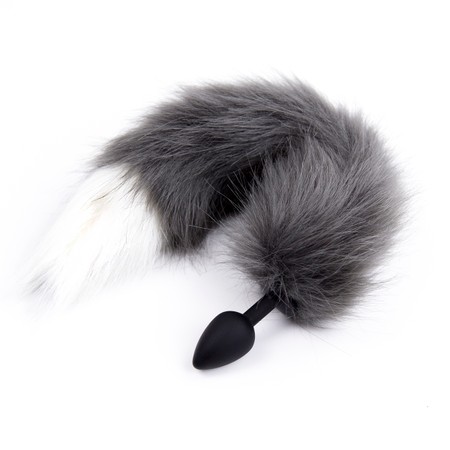 פלאג סיליקון קטן שחור המחובר לזנב פרוותי של שועל בצבע אפרפר בעל קצה לבן